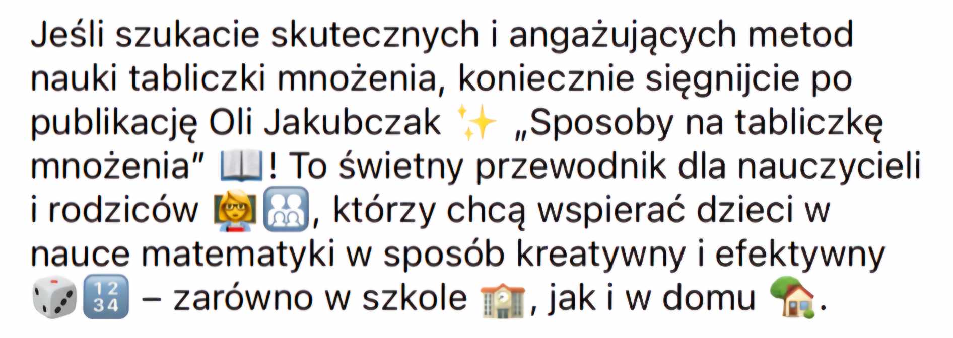 Ebook „Sposoby na tabliczkę mnożenia” to wyjątkowy przewodnik dla nauczycieli i rodziców, który łączy najnowsze odkrycia z dziedziny neurodydaktyki z praktycznymi metodami nauczania. Autorka dzieli się swoim wieloletnim doświadczeniem, oferując strategie, które pomagają uczniom zrozumieć i polubić matematykę. Publikacja jest pełna konkretnych przykładów, gier edukacyjnych, zabaw ruchowych i aktywności, które angażują uczniów i czynią naukę tabliczki mnożenia przyjemną.
